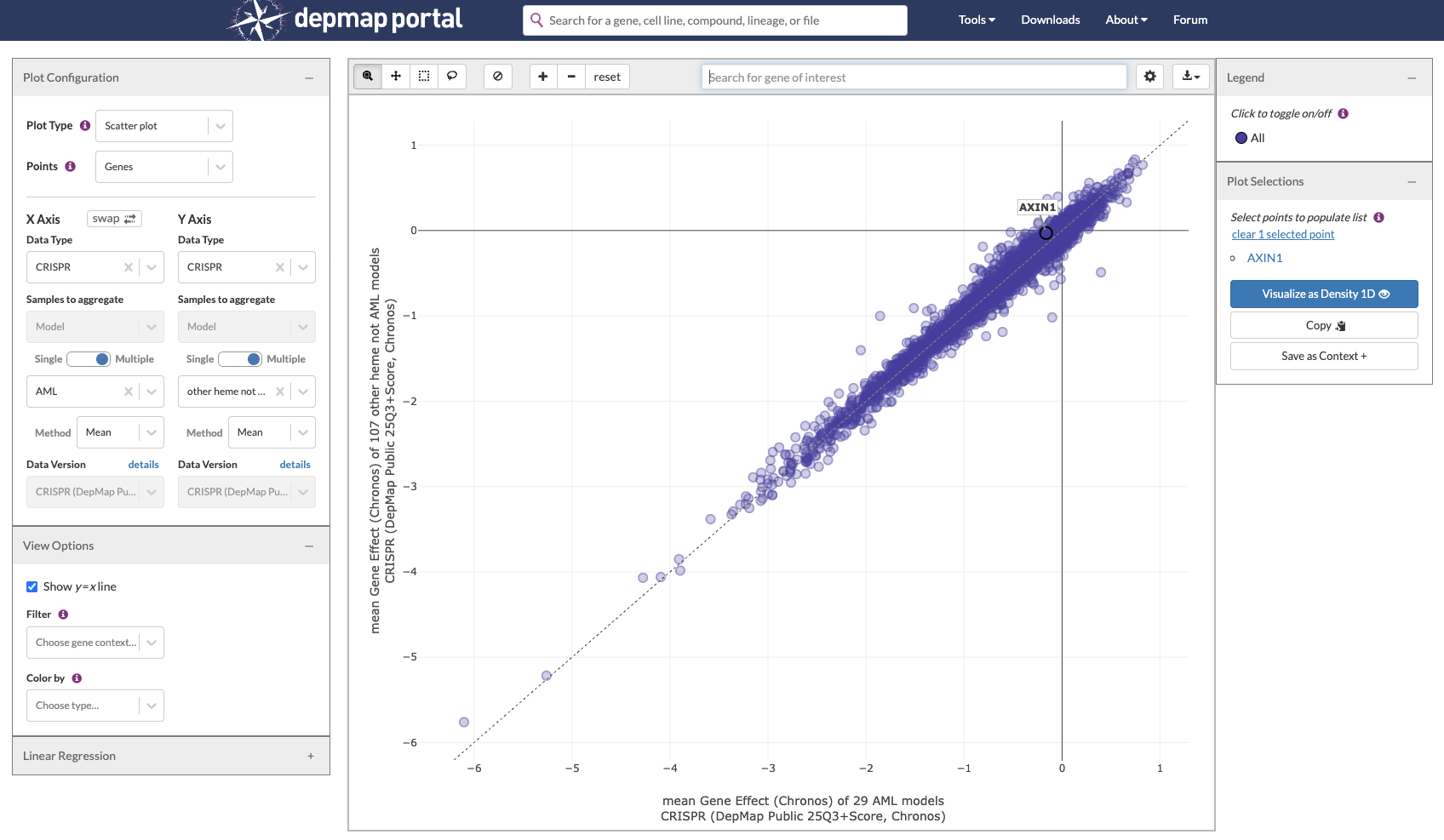 I was curious whether this enrichment was likely due to the change in the data or the change in methodology. When I compared the dependency of AML lines and non-AML heme lines, AXIN1 appeared fairly close to the x=y line, suggesting that if you saw enrichment before, it’s likely not reporting an enrichment now due to the changes in the data and not the methodology.